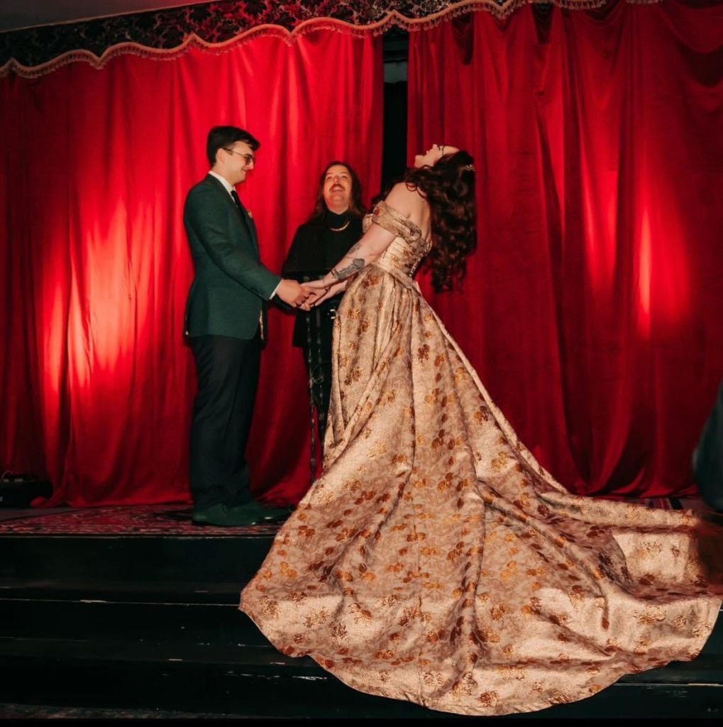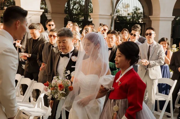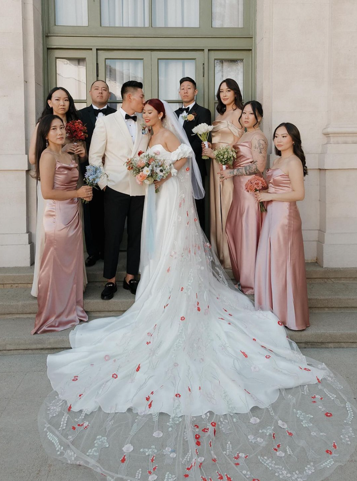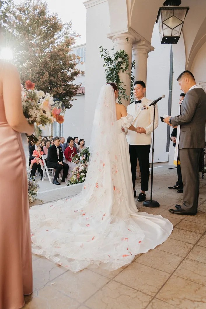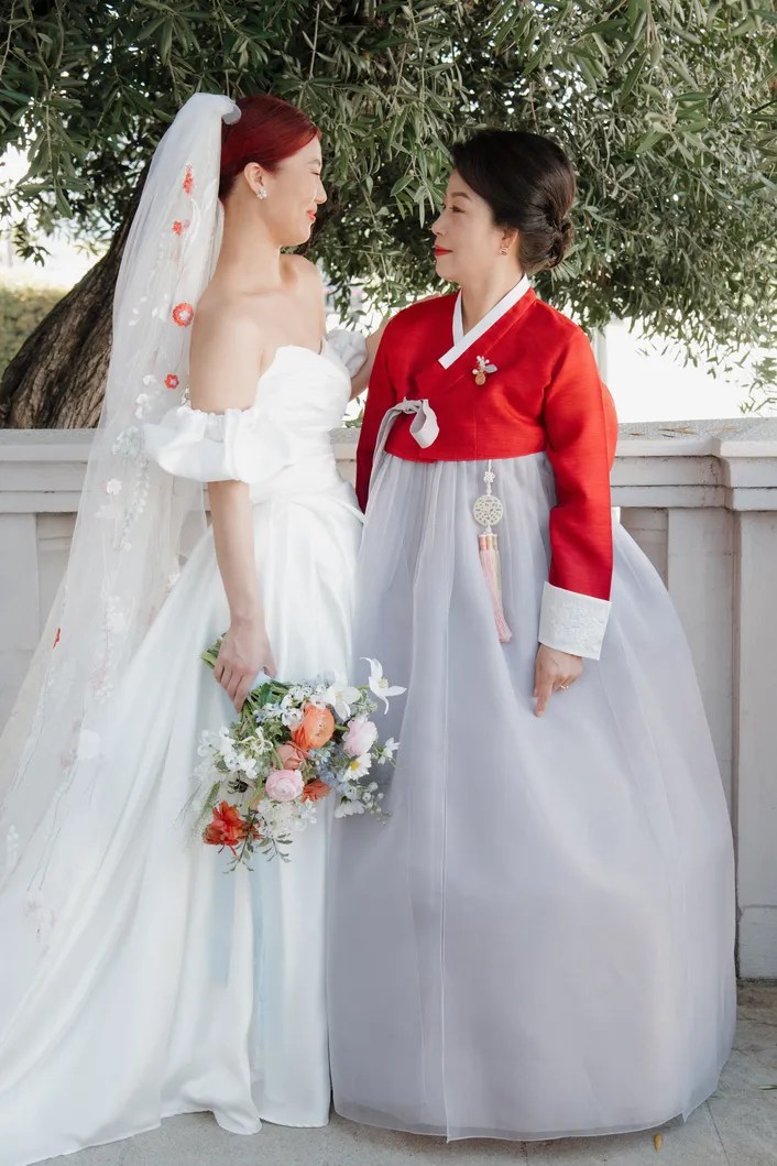 Over the next few months, I became a superfan of Grace and her creativity. She had such a clear vision for how she wanted to look for her big day-from the modern puff sleeves Daiana suggested to the colorful red veil that matched perfectly with her fiery red hair, to the architectural re-work of the strap of her second dress and pairing it with black gloves…she completely embodied Old Hollywood meets Modern rockstar. She paid homage to her Korean culture as well, which was very apparent throughout the wedding details.